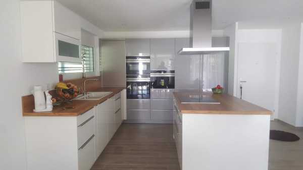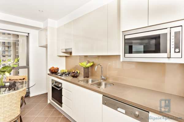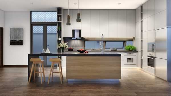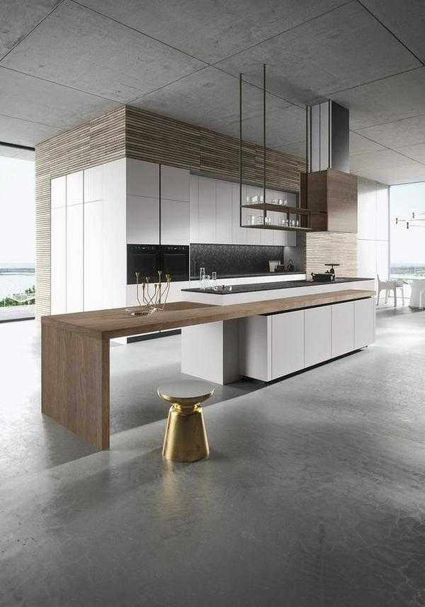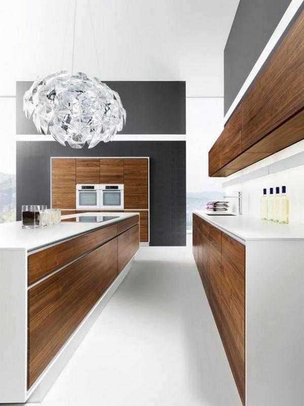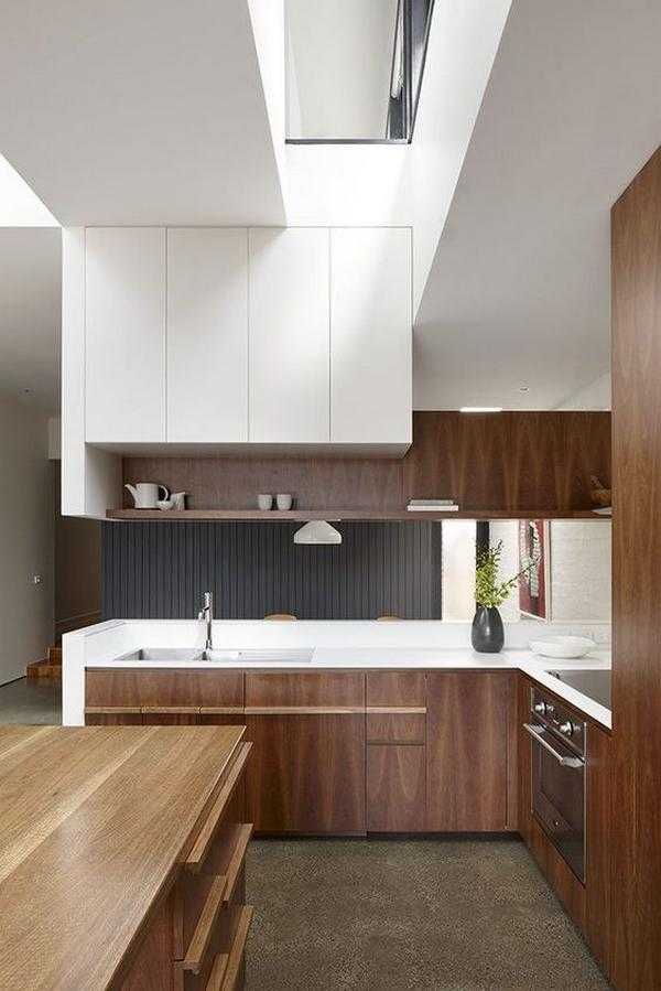 Белая кухня в современном стиле может быть с матовой или глянцевой поверхностью. Фасад должен быть без скосов, прямым и простым по форме. Деревянная столешница может быть из светлого, темного или черного дерева, сочетаться с полом или кухонным столом. Из декора подойдут часы с простым круглым циферблатом, контрастные рулонные шторы. Для стиля минимализм подойдет матовая кухня с глухими дверцами, темно-коричневая столешница.