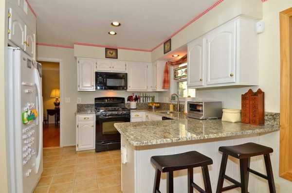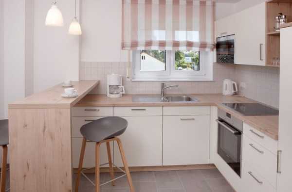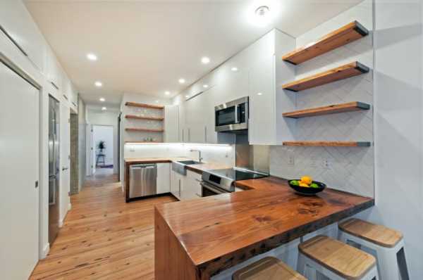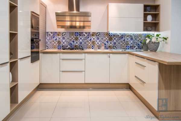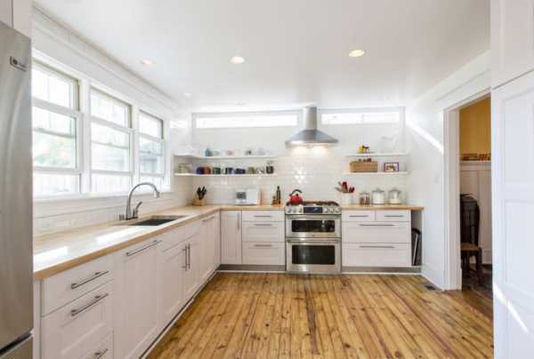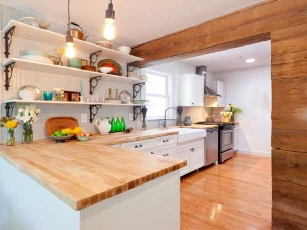 П-образная белая кухня с деревянной столешницей подойдет для помещения прямоугольной формы, где в вершине буквы «п» можно разместить мойку или дополнительные полки, поверхности. При такой планировке важно не заставить окно мебелью. В маленькой кухне негде будет поставить обеденный стол, поэтому его можно перенести в отведенную зону гостиной.