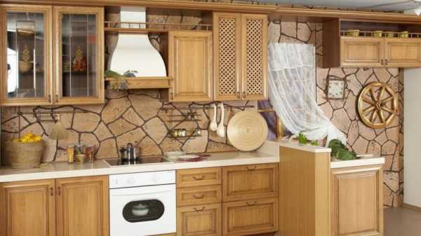 Вытянуть невысокие окна помогут ткани с вертикальной широкой полосой, а зрительно расширить стену – с горизонтальным акцентом.Отделка стен на кухне с деревянной мебелью