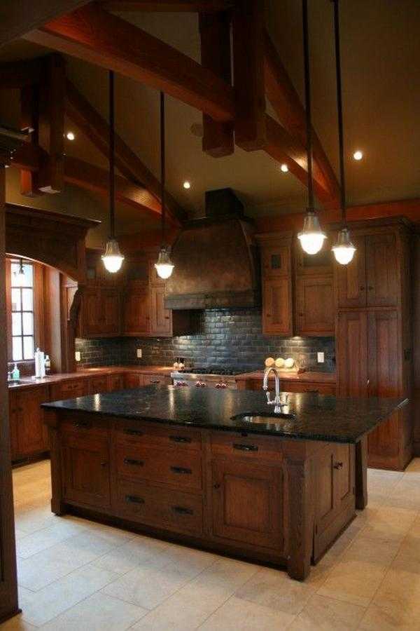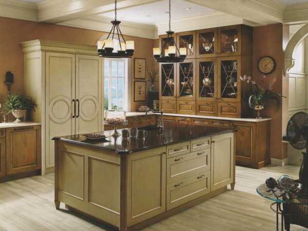 Если кухня с деревянным гарнитуром и такой же мебелью достаточно просторная, то к организации освещения можно подойти с размахом. К примеру, в самом ее центре можно установить массивную хрустальную люстру (одно- или двухуровневую). Отлично будет смотреться люстра подвесной конструкции, стилизованная под большой канделябр, с установленными в нем лампочками в виде свечей.