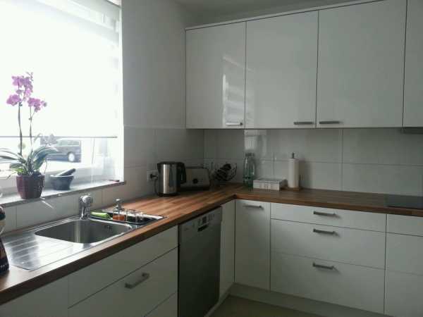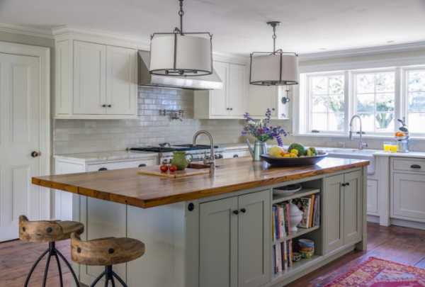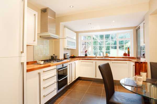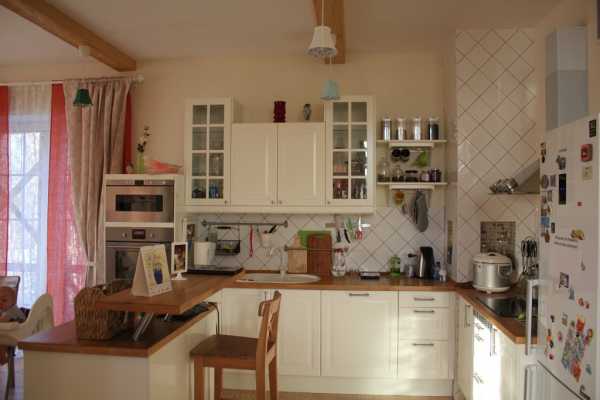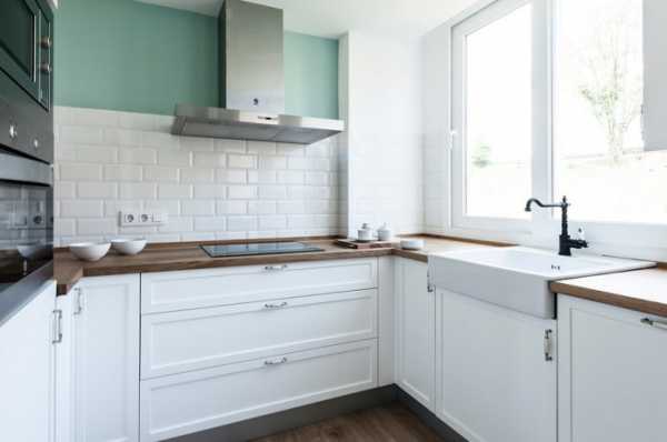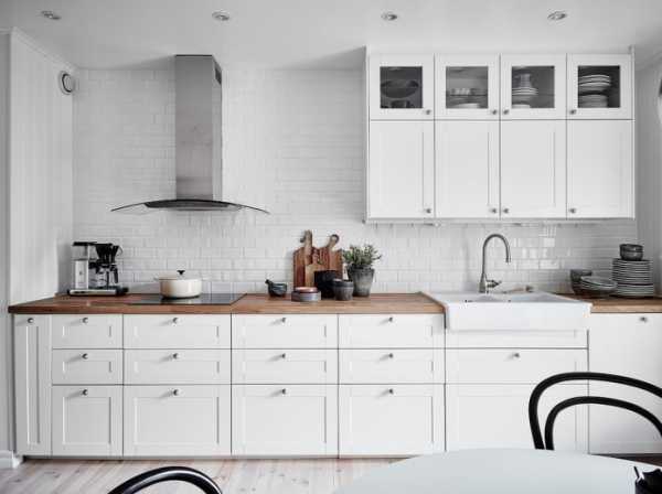 Белый кухонный гарнитур с деревянной столешницей можно назвать универсальным вариантом для кухни любого размера и стиля, который также легко видоизменять при помощи штор и текстиля другого оттенка. Ниже представлены фото примеры использования деревянной столешницы в интерьере кухни с белыми фасадами.