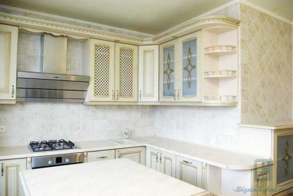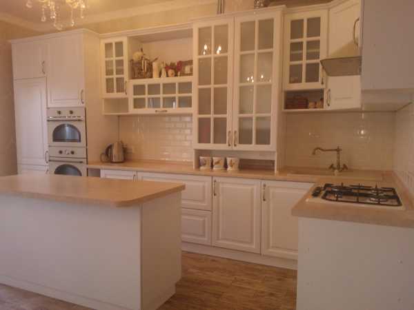 На фото кухня в классическом стиле с матовым гарнитуром, который облегчают стеклянные дверцы шкафов.