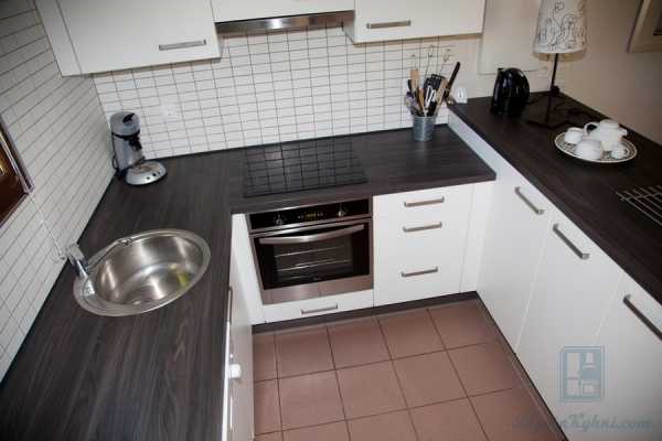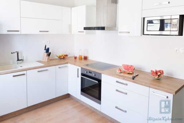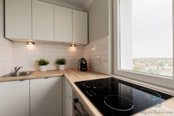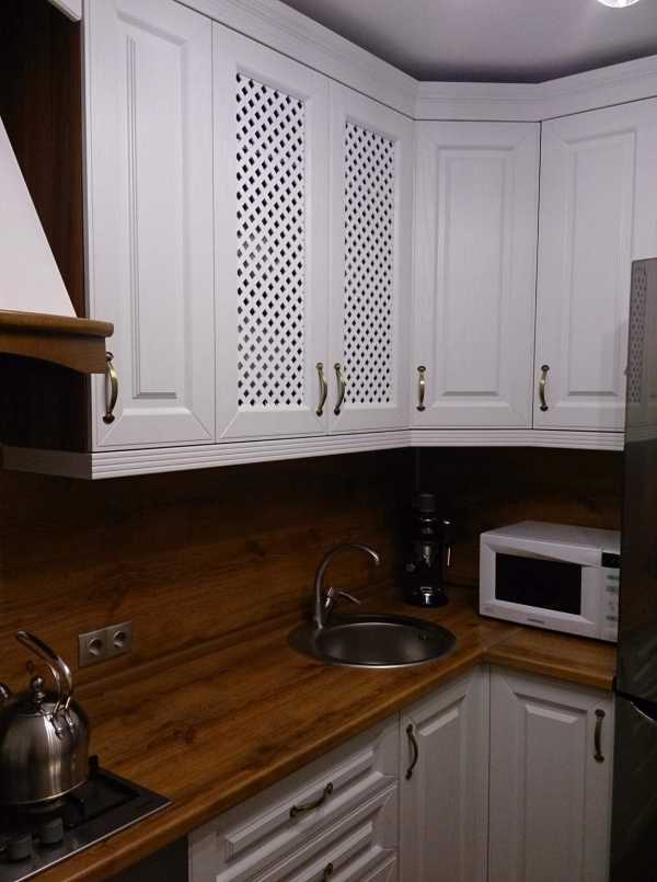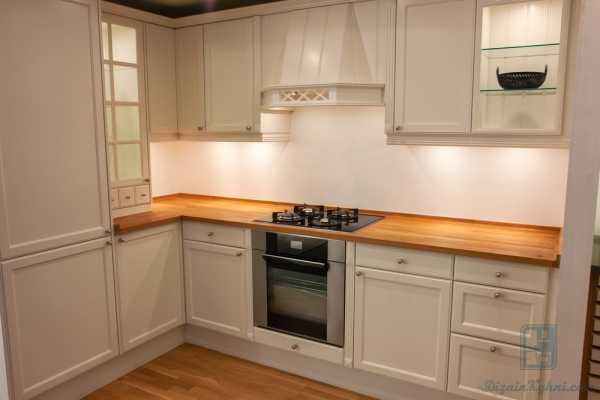 Угловая белая кухня с деревянной столешницей подходит для рациональных хозяек и маленьких пространств. Здесь задействован угол, который при обычной планировке остается неиспользованным. В угол можно поместить мойку, а под ней в эргономичном шкафу хранить не так часто нужные кухонные вещи. Угол также можно сделать при помощи откидной барной стойки, которая выручит при быстрых обедах.