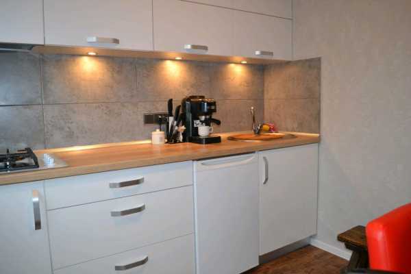 | Под тон столешницы | Можно сделать фартук под цвет столешницы из плитки под дерево или ламината. Однородность рабочей поверхности может сочетаться с полом и выглядеть контрастно на фоне белого гарнитура. |