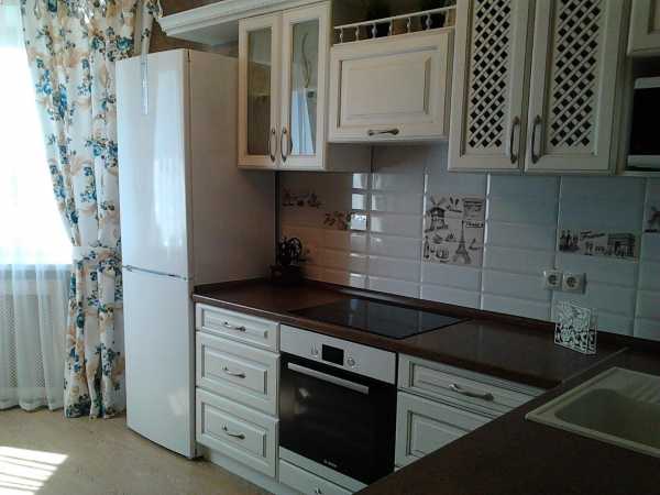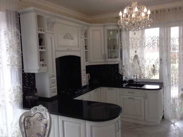 Белая кухня должна быть исключительно матовой со стеклянными дверцами, резьбой, завитками, позолоченной, черной или серебряной фурнитурой. Деревянная столешница должна быть из массива дерева темных пород под цвет ламината или паркета. Из декора подойдут короткие шторы по типу французских или австрийских, римские шторы, ламбрекен, текстиль под обивку, чайный сервиз, круглый обеденный стол.