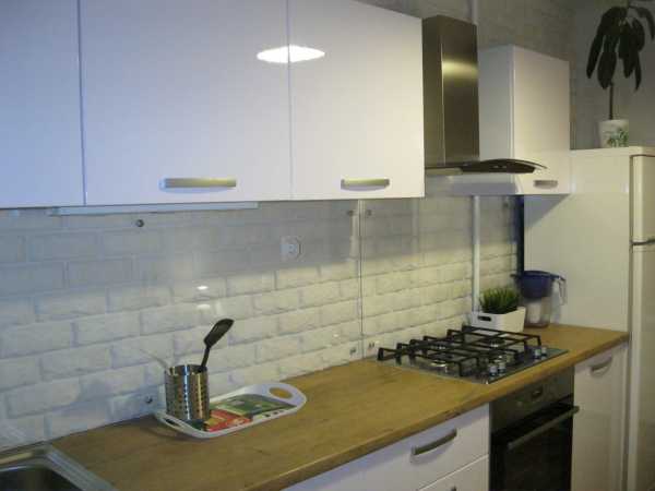 Фартук на белой кухне может быть акцентом или нейтральным функциональным декором. Он может быть из прочного стекла с печатью, из ламината, плитки.