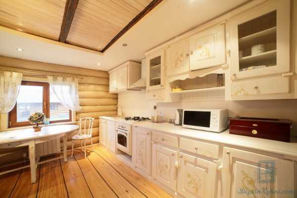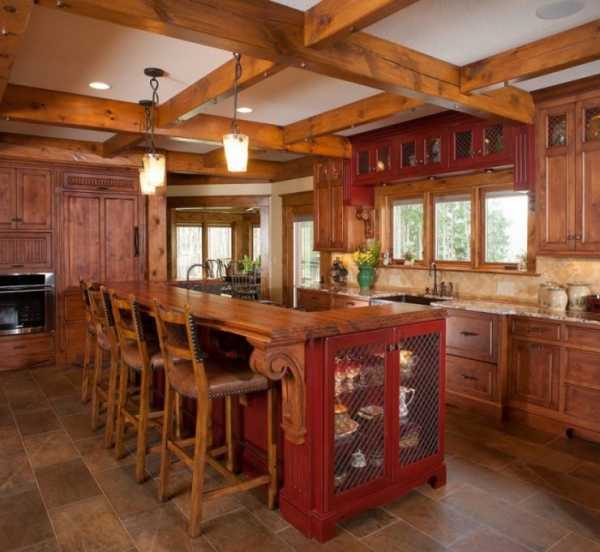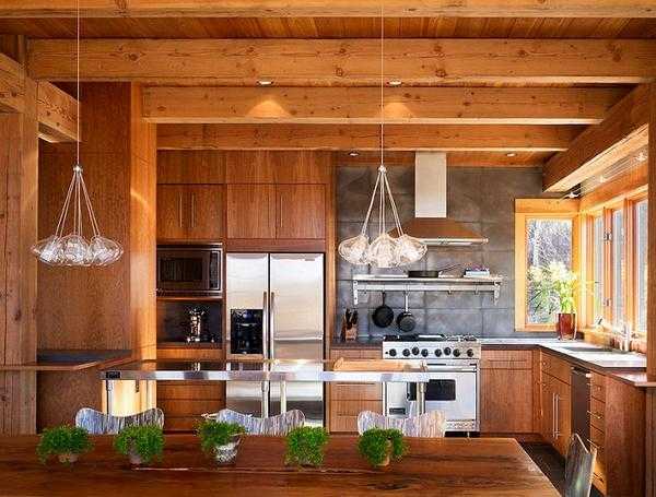 Не только мебель может выполняться из дерева, но и стены, полы и потолок тоже могут быть деревянными в интерьере кухни.