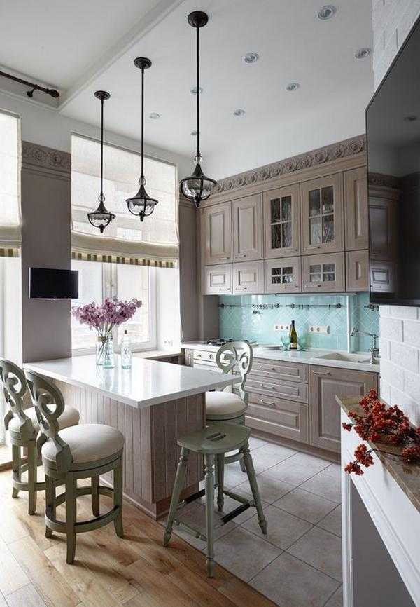 Стиль отличается видом мебели, способом установки раковины и необычным декором. Стены должны быть пастельного зеленого, розового цвета, на фоне которого будет белая кухня с деревянной столешницей. Из декора подойдут полевые цветы, вязаный текстиль, вышитые занавески или шторы-кафе с принтом, деревянные часы, фартук из керамики с геометрическим цветным узором.