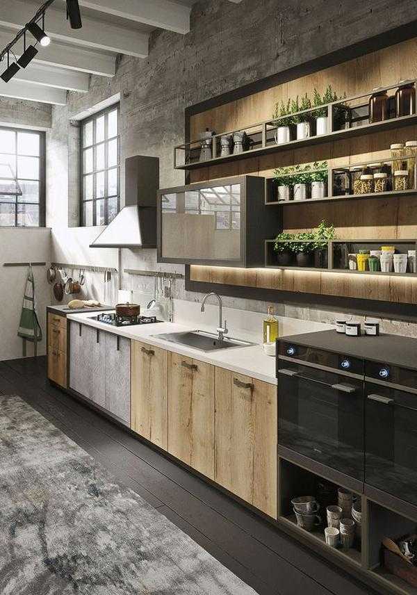Можно создать при помощи темной столешницы из дерева, белой кухни с глянцевыми фасадами, кирпичной стеной над рабочим столом или у обеденного стола. Из декора подойдут люстры с металлическими абажурами, хромированные смесители, кактусы, стеклянная посуда.