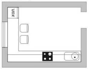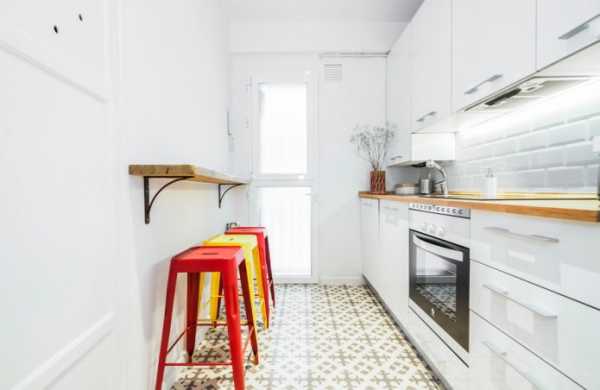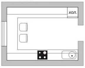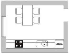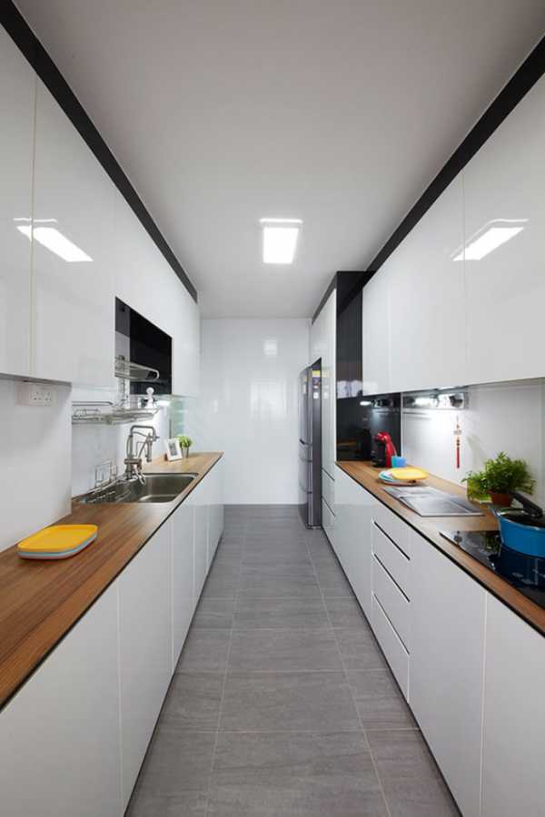 На фото: небольшая кухня, в узком помещении