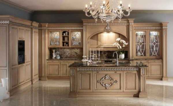 Натуральный деревянный фасад, сделанный из бессучкового мебельного щита, хорошо впишется в кухню классического стиля.Приветствуется позолота, а также резные элементы на фасадах гарнитура. Синтетическим дешевым материалам на подобной кухне места нет.