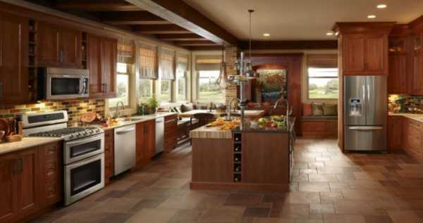 Чтобы снизить опасность использования керамической плитки, нужно для пола выбирать сорта с шероховатой фактурой.При обустройстве кухни в стиле деревенский или кантри, для отделки пола можно выбрать обычную деревянную доску. Паркет станет украшением кухни, обустроенной в стиле средиземноморский, шебби-шик или прованс.