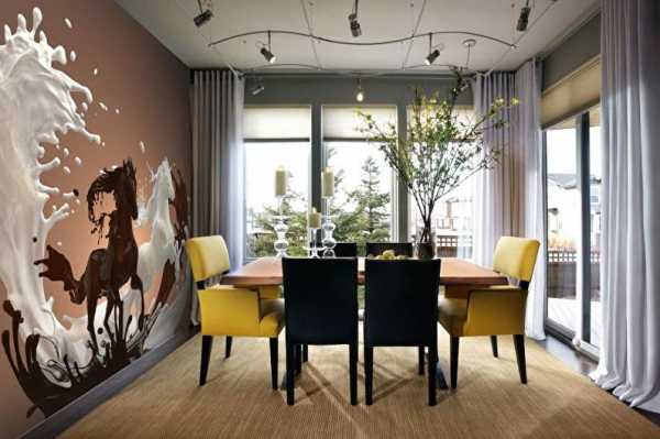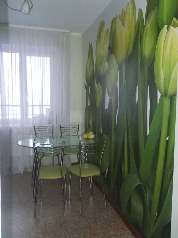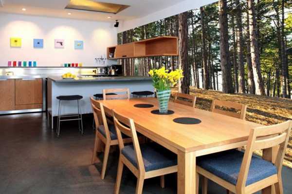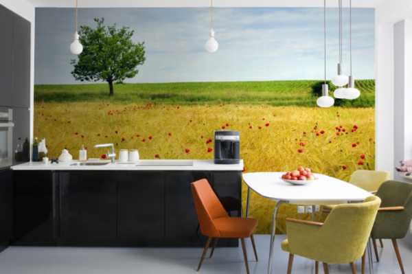 Обычно декорирование проводят в зоне обеденного стола. Выбирают фотообои в спокойных тонах, сочетающихся с окружающим пространством. Можно использовать не только большие и широкоформатные пейзажи, например, поле с желтыми подсолнечниками. Но и декоративные панно, узкие фотообои, модульные картины.