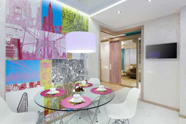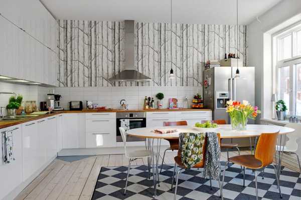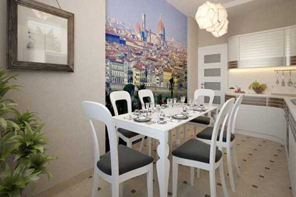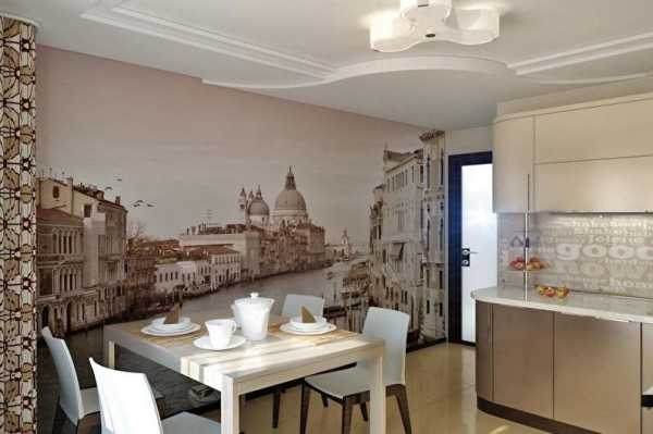 Наклеивание на одну из стен фотообоев сделает кухню красивой