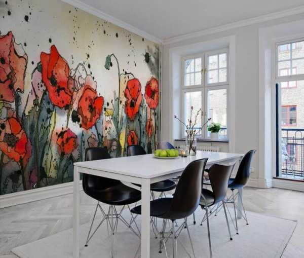 Главное назначение фотоизображений в зоне обеденного стола — создание приятной атмосферы, благоприятствующей комфортному приему пищи. Рисунки должны возбуждать аппетит. Поэтому чаще всего выбираются фотообои с натюрмортами, гастрономическими пейзажами, красивыми цветами.