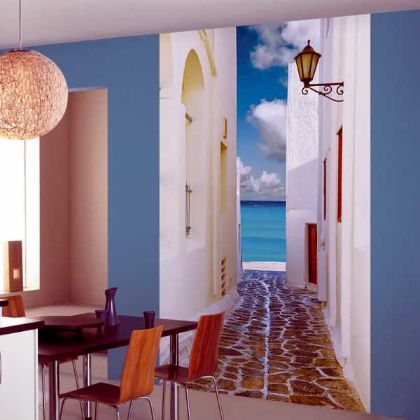 Спокойствие и умиротворение подарят виды Венеции с водными каналами. Или же Греции, с ее уникальной архитектурой. Отличный вариант — ночной город, освещенный миллионом огней. Урбанистические фотообои можно клеить не только на стены, но и на кухонную мебель, на переднюю панель холодильника. Чтобы зрительно приподнять потолок, рекомендуется использовать изображения небоскребов, Эйфелевой башни, высотных домов.
