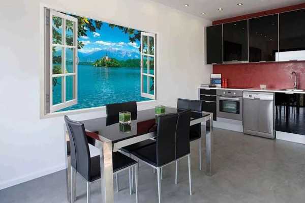 - Фотообои на маленькой кухне должны иметь изображение пейзажа с видом из окна. Неплохим вариантом станут фотообои с 3д рисунком для кухни. Они позволят визуально расширить пространство.
