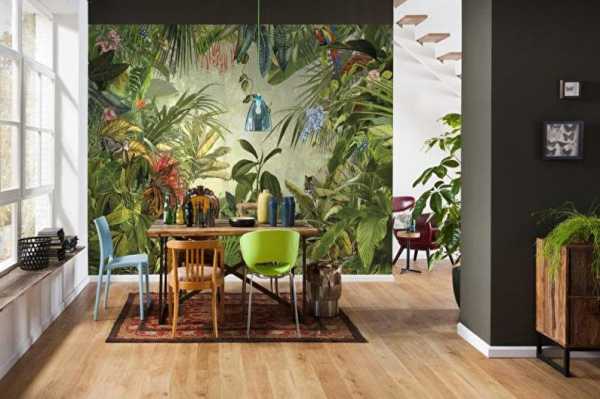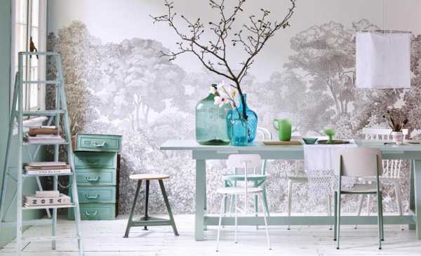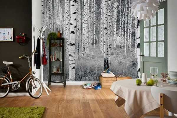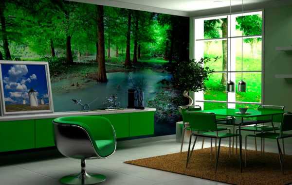 Зеленый цвет делает интерьер теплым, жизнерадостным. При таком цветовом решении дизайнеры рекомендуют использовать фотообои в светлых тонах с незначительным «вкраплением» темно-коричневых, серых и даже черных оттенков. Важно, чтобы интерьер не получился слишком пестрым.