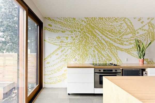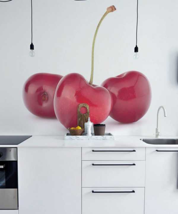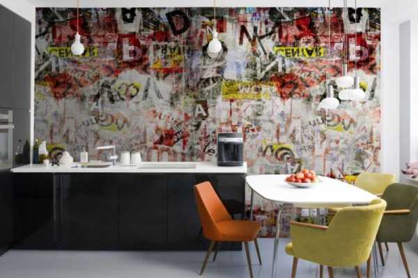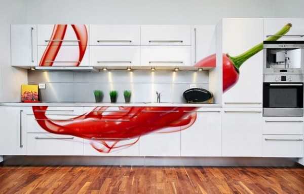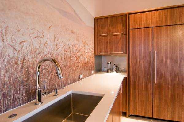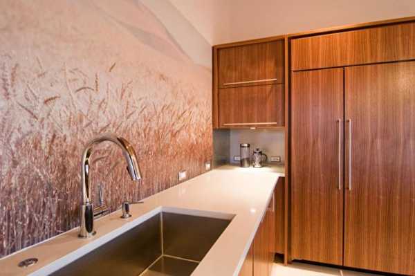 В отличие от стандартных материалов большие картинки позволяют сделать кухню оригинальной и индивидуальной. Однако решение не очень популярно в дизайнерской среде, так как при ненадлежащем уходе быстро выходит из строя. Но если приобрести качественный материал на флизелиновой основе с верхним грязе- и водоотталкивающим слоем, проблем с уборкой и длительностью эксплуатации возникнуть не должно. Представленные изделия не впитывают воду, грязь и жир, не боятся механических воздействий и не теряют цвет под воздействием солнечных лучей.
