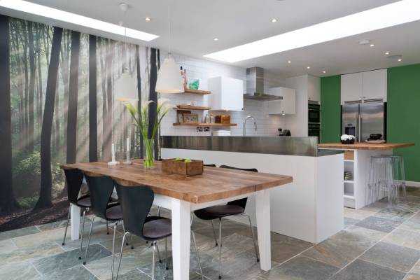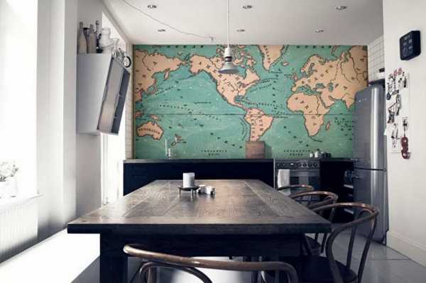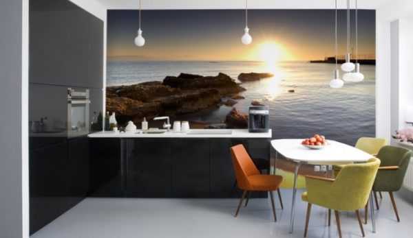 Для многих людей кухня остается местом приема гостей. При этом современные люди часто делают ее и игровой, рабочей зоной, мастерской. Ввиду этого, помещение должно быть не только функциональным и практичным, но и красивым. Выполнить эту задачу может наклеивание на одну из стен фотообоев.