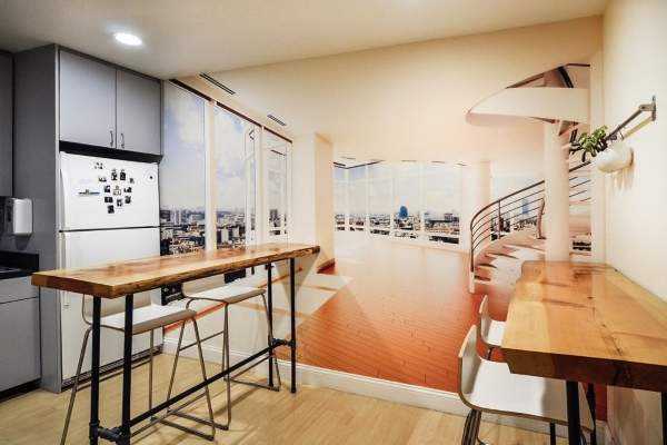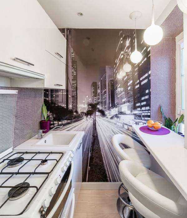 Важную роль играет не только сочетание цветов, но и рисунок, фактура материала фотообоев. Например, вертикальное расположение черно-белых полос визуально приподнимет потолок. А изображение с перспективой раздвинет стены кухни.