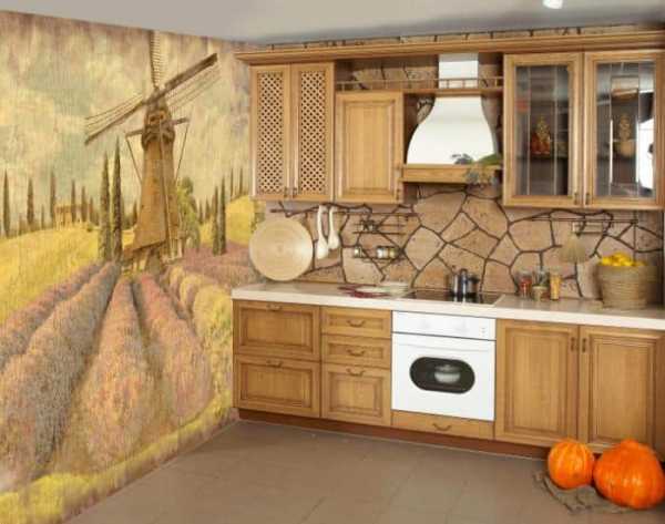 Для отделки кухонь нередко используют фрески — фотообои с имитацией живописи. Рисунки могут быть самыми разными. Это и натюрморты с кухонными мотивами, и романтичные пейзажи, и абстракция. Вариантов множество. Фрески могут иметь разные размеры. Выбор зависит от габаритов помещения, особенностей оформления.