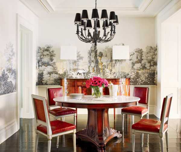 Каталог может включать в себя темные обои с множеством мелких рисунков. Такой вариант выглядит весьма эффектно, но для маленького помещения не подойдет. При этом, выполнив такой дизайн, будет казаться, что на кухне все время царит беспорядок. Для небольшого помещения лучше выбрать однотонные материалы с большими предметами – ягодами, цветами и прочим. Можно посмотреть каталог и найти изображения лестниц или аллей – они тоже помогут увеличить пространство.