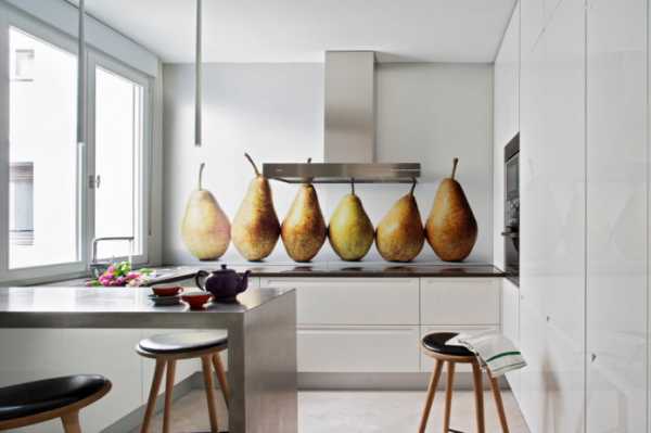 Маленькие картины удобно размещать над раковиной или плитой. Дизайнеры нередко используют для украшения интерьера несколько фресок, размещенных в разных местах кухни, объединенных единым стилем и тематикой.