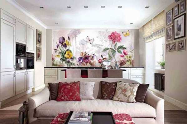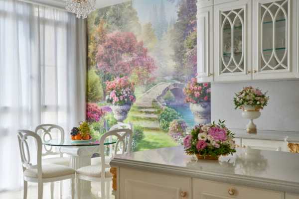 Фотообои с цветами делают интерьер светлым и уютным. Королевские розы, нежные ромашки, благородные пионы дарят атмосферу праздника. В такой кухне тепло даже в самые пасмурные холодные дни. Фотообои бывают сюжетными, например, с изображением красивой арки, увитой гирляндой цветов. А также предметными — букеты, натюрморты, отдельные крупные элементы цветущих растений. Еще один вид — панорамные картины с пейзажами.