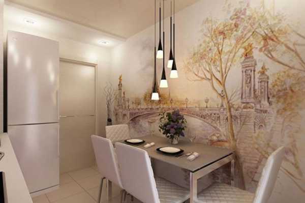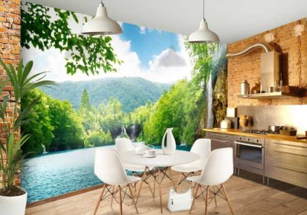 Фотообои с рисунком пейзажа прекрасно подойдут для небольшой кухни