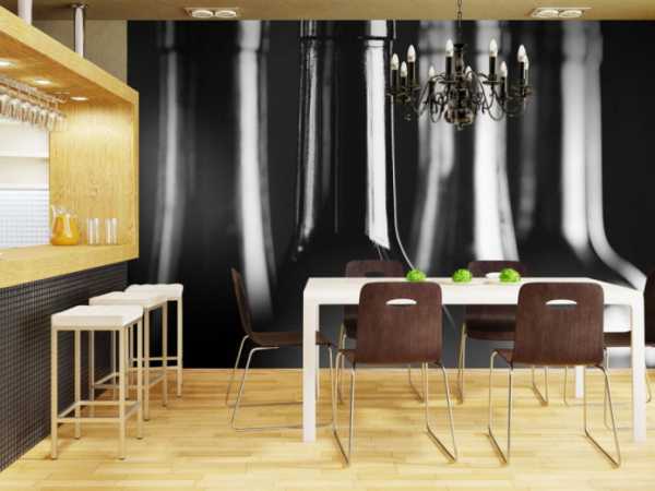 Черно-белые фотообои способны скорректировать интерьер, зрительно изменить пространство кухни. Чем больше темного, тем помещение кажется меньше. Расстояние до предметов обстановки представляется короче, чем есть на самом деле. Белый цвет, наоборот, зрительно увеличивает территорию. Делает пространство просторным и светлым.
