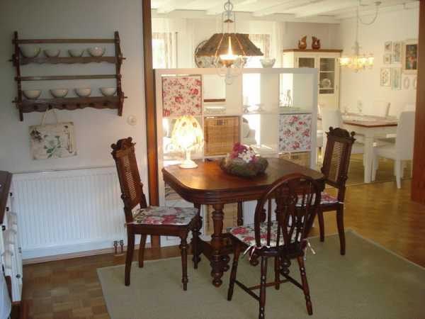 Π ΠΎΠΌΠ°Π½ΡΠΈΡΠ΅ΡΠΊΠΎΠ΅ Π½Π°ΡΡΡΠΎΠ΅Π½ΠΈΠ΅ ΡΡΠ°Π½ΡΡΠ·ΡΠΊΠΎΠΉ ΠΏΡΠΎΠ²ΠΈΠ½ΡΠΈΠΈ Π±ΡΠ΄Π΅Ρ Π½Π°ΠΈΠ±ΠΎΠ»Π΅Π΅ ΡΠΌΠ΅ΡΡΠ½ΡΠΌ Π² Π·Π°Π³ΠΎΡΠΎΠ΄Π½ΠΎΠΌ Π΄ΠΎΠΌΠ΅. ΠΠ΄Π΅ΡΡ ΠΊΡΡ Π½Ρ, ΡΠΎΠ²ΠΌΠ΅ΡΠ΅Π½Π½ΡΡ Ρ Π³ΠΎΡΡΠΈΠ½ΠΎΠΉ, ΠΌΠΎΠΆΠ½ΠΎ ΠΎΠ±ΡΡΠ°Π²ΠΈΡΡ Ρ ΠΈΠ·ΡΡΠΊΠ°Π½Π½ΡΠΌ Π²ΠΊΡΡΠΎΠΌ ΠΈ Π±ΠΎΠ»ΡΡΠΎΠΉ ΡΠ°Π½ΡΠ°Π·ΠΈΠ΅ΠΉ. Π’Π°ΠΊ, Π·ΠΎΠ½Ρ Π³ΠΎΡΠΎΠ²ΠΊΠΈ ΡΠΊΡΠ°ΡΠΈΡ ΡΡΠΈΠ»ΠΈΠ·ΠΎΠ²Π°Π½Π½ΡΠΉ ΠΊΠ°ΠΌΠΈΠ½ ΠΈΠ»ΠΈ Π²ΡΡΡΠΆΠΊΠ° Π² Π²ΠΈΠ΄Π΅ Π±Π΅Π»Π΅Π½Π½ΠΎΠΉ ΠΏΠ΅ΡΠ½ΠΎΠΉ ΡΡΡΠ±Ρ, Π²ΠΈΠ½ΡΠ°ΠΆΠ½ΡΠΉ Π³Π°ΡΠ½ΠΈΡΡΡ, Π΄Π΅ΡΠ΅Π²ΡΠ½Π½ΡΠ΅ Π±Π°Π»ΠΊΠΈ Π½Π° ΠΏΠΎΡΠΎΠ»ΠΊΠ΅; Π³ΠΎΡΡΠ΅Π²ΡΡ β ΠΌΡΠ³ΠΊΠΈΠΉ Π΄ΠΈΠ²Π°Π½ ΠΈ ΠΊΡΠ΅ΡΠ»Π° Ρ ΠΌΠΈΠ»ΠΎΠΉ ΡΠ²Π΅ΡΠΎΡΠ½ΠΎΠΉ ΠΎΠ±ΠΈΠ²ΠΊΠΎΠΉ, Π½ΠΎ ΡΠ΅Π½ΡΡΠ°Π»ΡΠ½ΡΡ ΡΠ°ΡΡΡ Π²ΡΠ΅Π³ΠΎ Π°Π½ΡΠ°ΠΌΠ±Π»Ρ ΠΎΠ±ΡΠ·Π°ΡΠ΅Π»ΡΠ½ΠΎ Π΄ΠΎΠ»ΠΆΠ΅Π½ Π·Π°Π½ΠΈΠΌΠ°ΡΡ Π±ΠΎΠ»ΡΡΠΎΠΉ ΠΎΠ±Π΅Π΄Π΅Π½Π½ΡΠΉ ΡΡΠΎΠ», Π½Π°ΠΊΡΡΡΡΠΉ ΠΊΡΠ°ΡΠΈΠ²ΠΎΠΉ ΡΠΊΠ°ΡΠ΅ΡΡΡΡ, Π·Π° ΠΊΠΎΡΠΎΡΡΠΌ ΡΠ°ΡΡΠΎ ΡΠΎΠ±ΠΈΡΠ°Π΅ΡΡΡ Π²ΡΡ ΡΠ΅ΠΌΡΡ.
