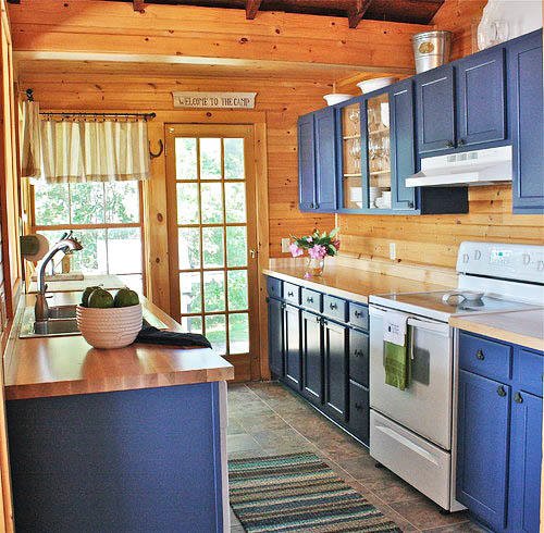 - Уютная загородная кухня в экостиле. Оформить помещение сложной конфигурации помогает выделение внутри него отдельных зон для приема пищи, хранения и приготовления блюд. Насыщенный синий цвет буфета на фоне стены из бруса выглядит свежо и оригинально. П-образный гарнитур с барной стойкой оставляет ощущение простора даже в небольшой кухне.