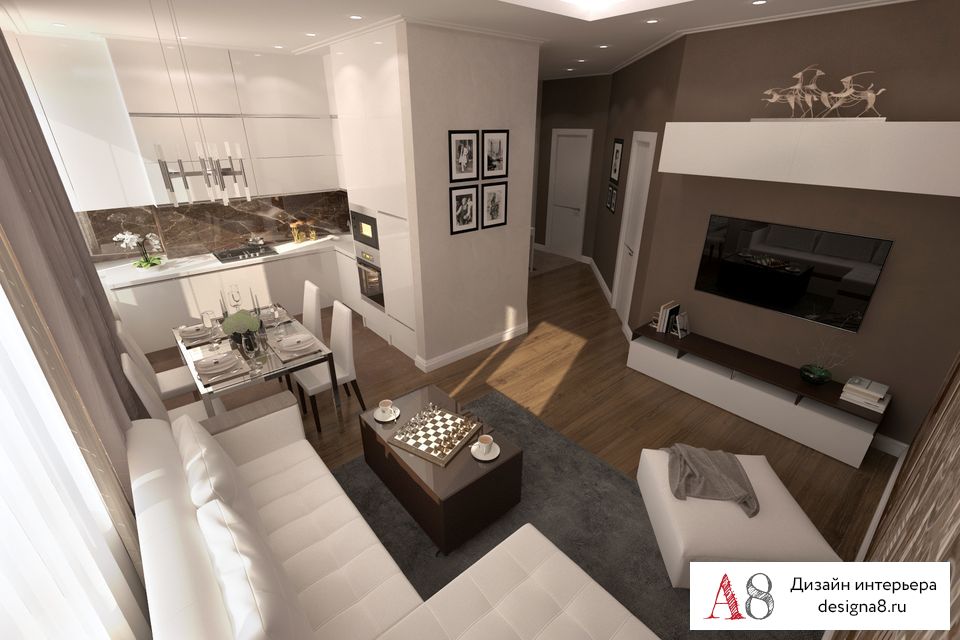Кухня, гостиная и столовая обустроены в пределах одной зоны, через которую осуществляется выход на балкон. Приватные помещения — спальня и ванная комната — находятся в глубине квартиры.