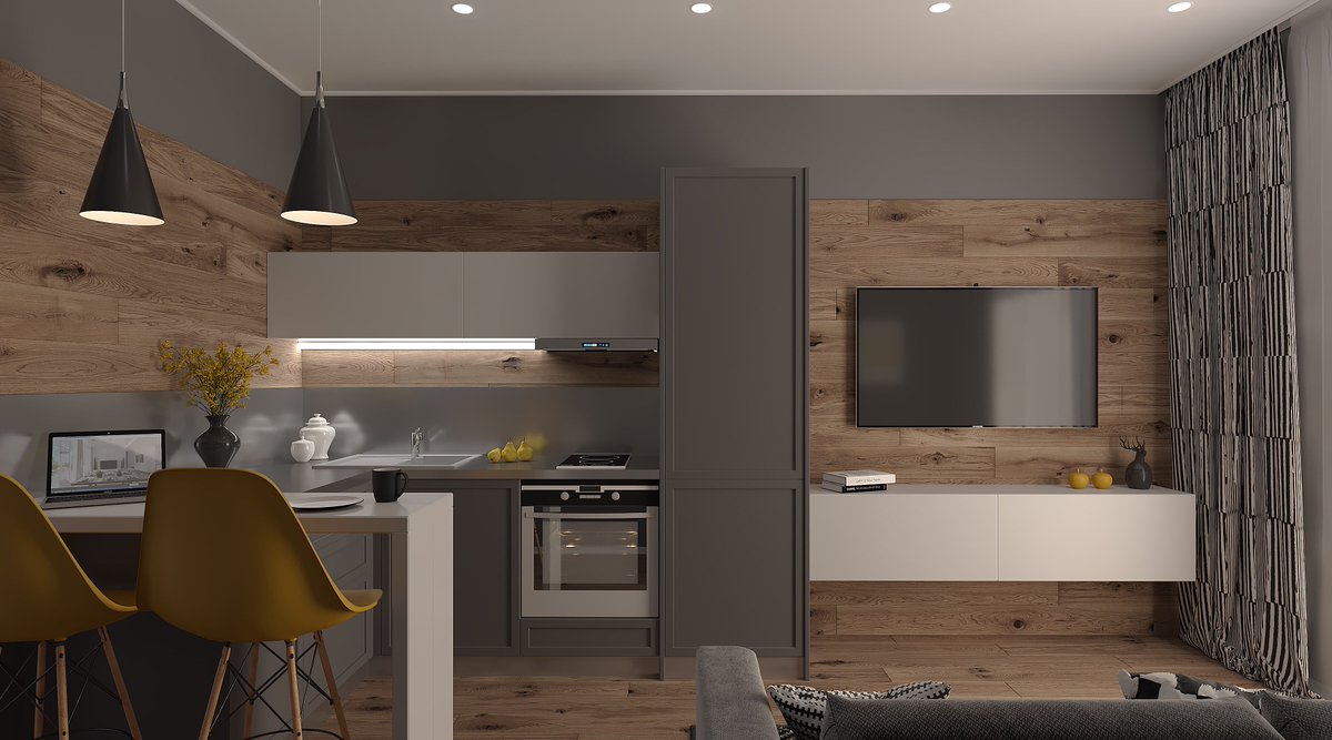 Помещение оснащено всем необходимым: в нем предусмотрены холодильник, вытяжка, варочная панель, посудомоечная машина, духовка с функцией СВЧ. По желанию хозяев нашлось место и для ТВ-панели.