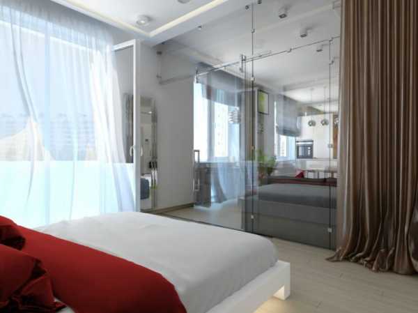 Проход из спальни в гостиную — через раздвижную дверь, также изготовленную из стекла. Непосредственно из спальни — вход в гардеробную, узкую, но при этом достаточно вместительную.