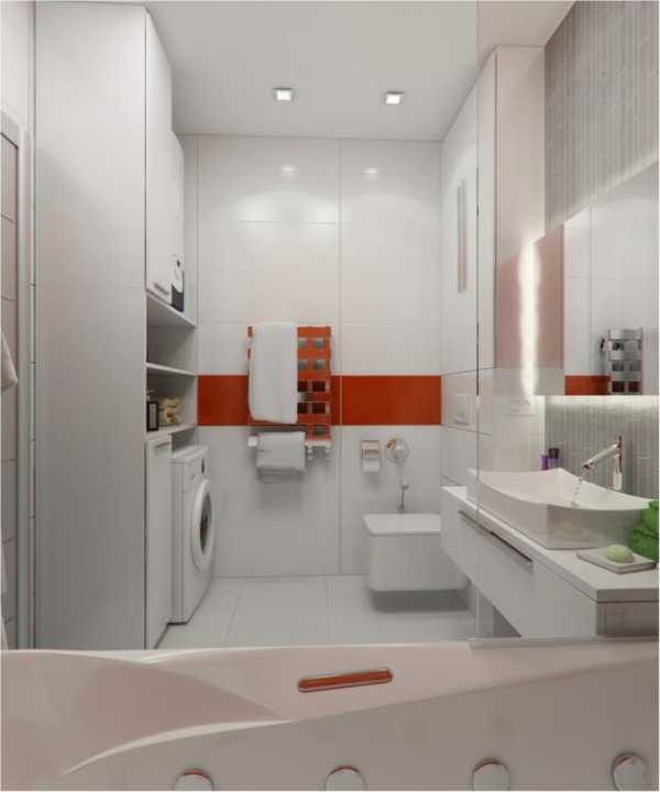 Размеры ванной комнаты позволили установить в ней джакузи, обладающую современными функциями. Здесь нашлось место для встроенных систем хранения и стиральной машины. Акцентный цвет в ванной — оранжево-красный. Он занимает практически всю стену над ванной, и опоясывает все помещение широкой полосой.