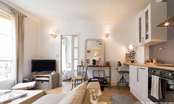Для небольшой квартиры-студии можно использовать монохромную палитру с преобладанием белого или бежевого. Контраст можно создать за счет нескольких ярких акцентов текстиля фиолетового, шоколадного, изумрудного, бордового или лилового цвета. Также можно повесить красивую люстру и зеркала необычной формы.