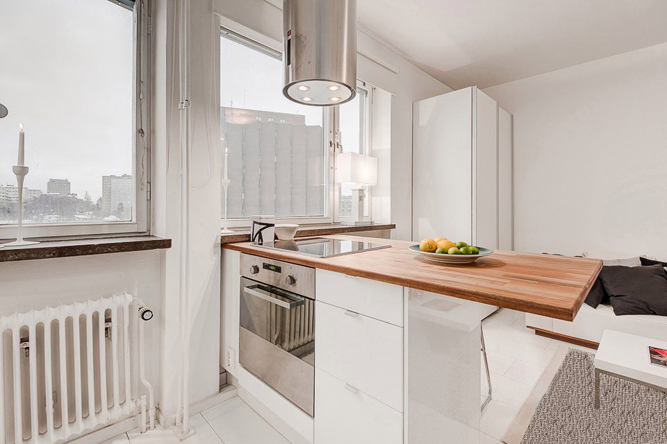 Если нет необходимости в выделении большой площади для кухни, и обеденный стол будет использоваться нечасто, то сэкономить место можно за счет кухонного гарнитура скромных размеров и обеденного столика, откидывающегося от стены.