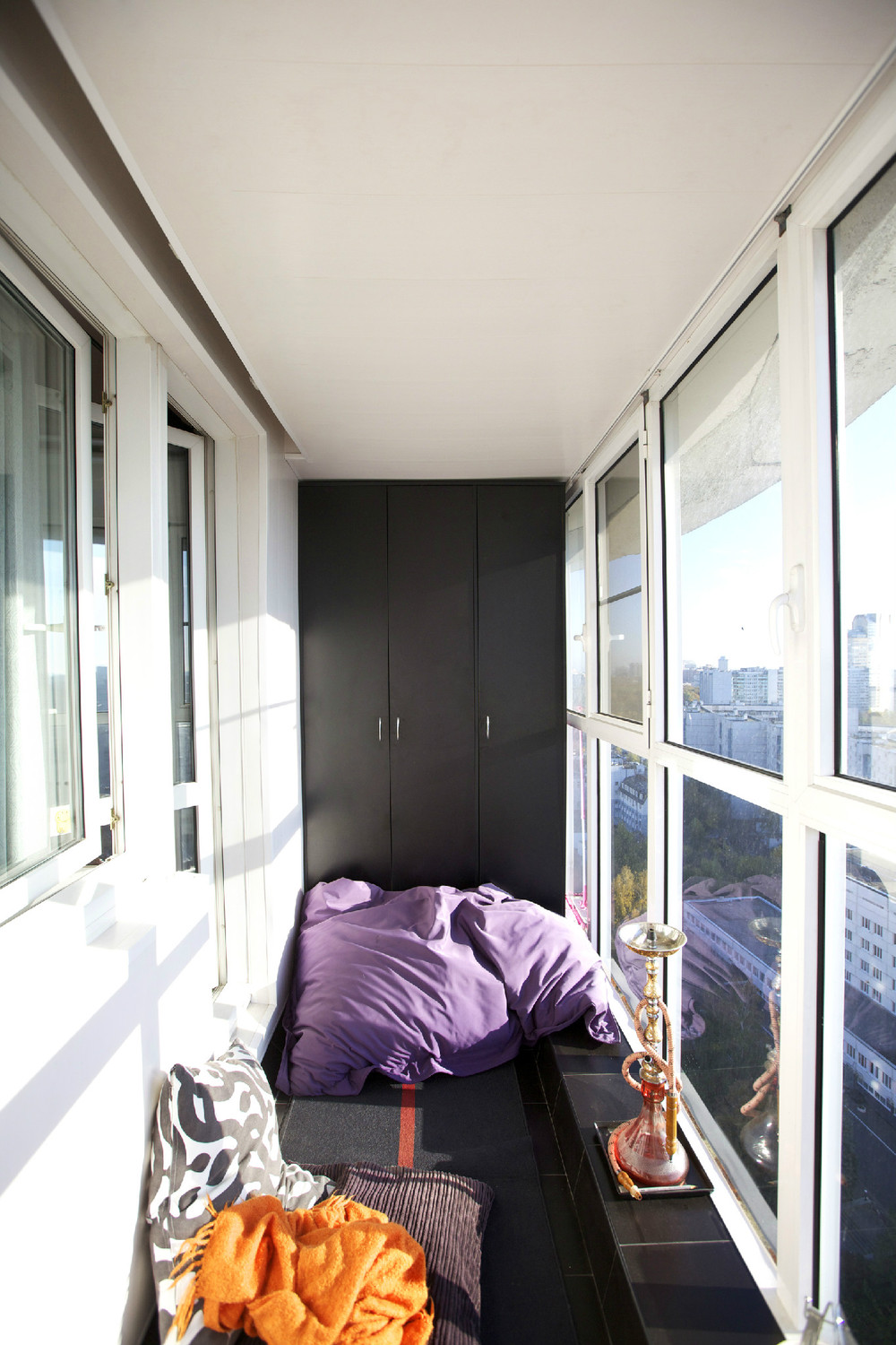 Зона отдыха. Балкон может быть отличным местом для уединения. Здесь легко поместиться односпальная кровать либо складной диванчик.