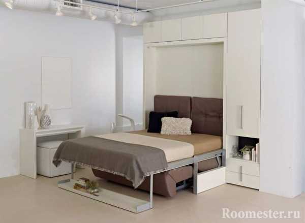 Если потолки достаточно высокие, место для сна можно оборудовать на импровизированном втором этаже. В таком случае под ней можно расположить вместительные шкафы, установить рабочий стол. Так вы разгрузите остальную часть площади.