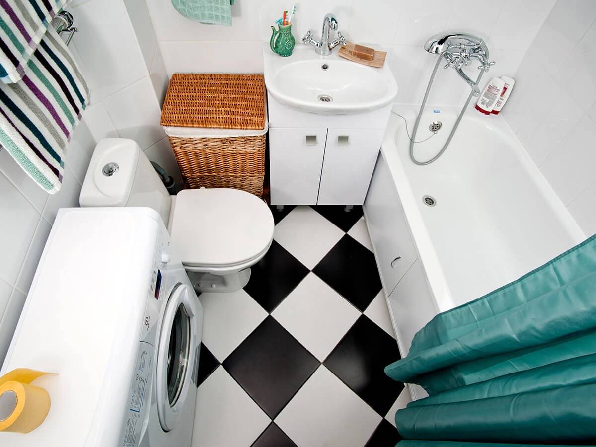 Дизайн маленькой ванной комнаты без туалета со стиральной машиной. Фото.