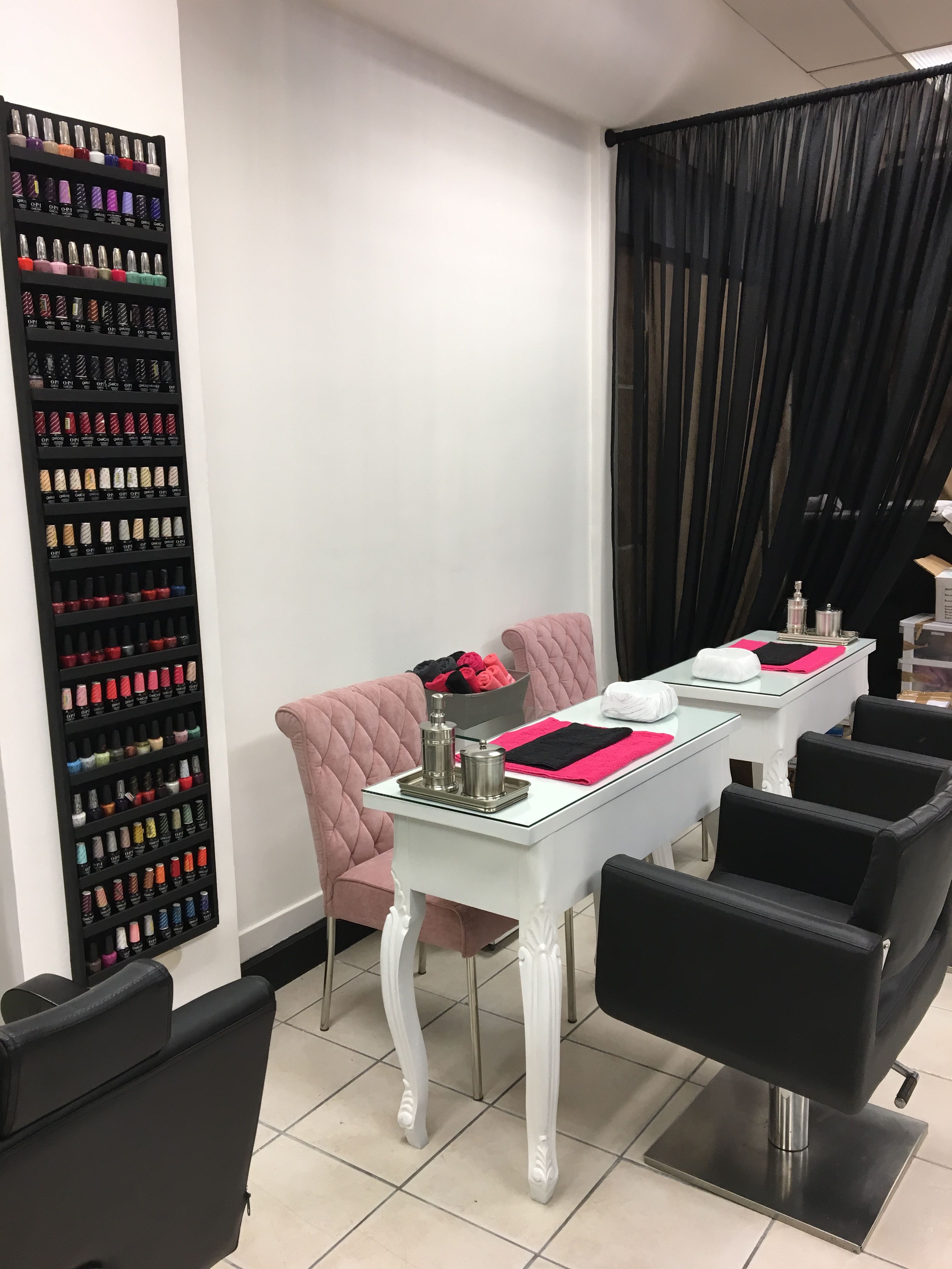 Маникюрные столы и стулья для ногтевых клиентов перечислены в середине магазина, поэтому он был выбран в белых тонах, чтобы сделать комнату более просторной и воздушной.