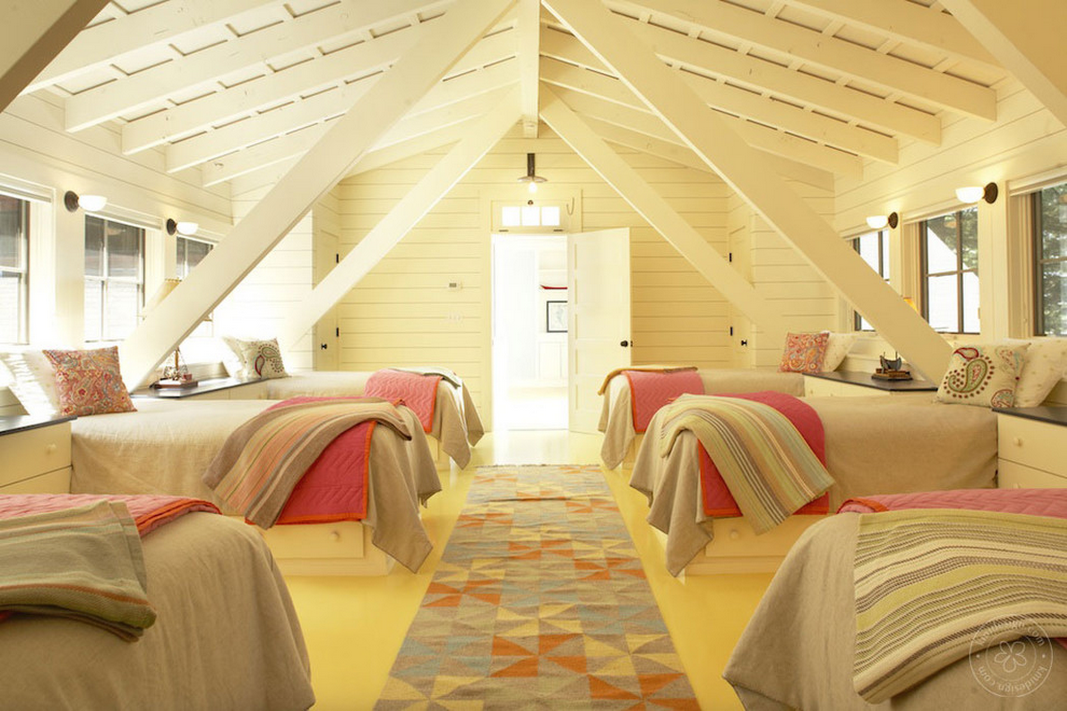 Если спальня уже есть, то из мансардного помещения можно сделать дополнительную гостевую комнату. Отличие лишь в размещении кроватей – их ставят под скатами вдоль всей крыши.
