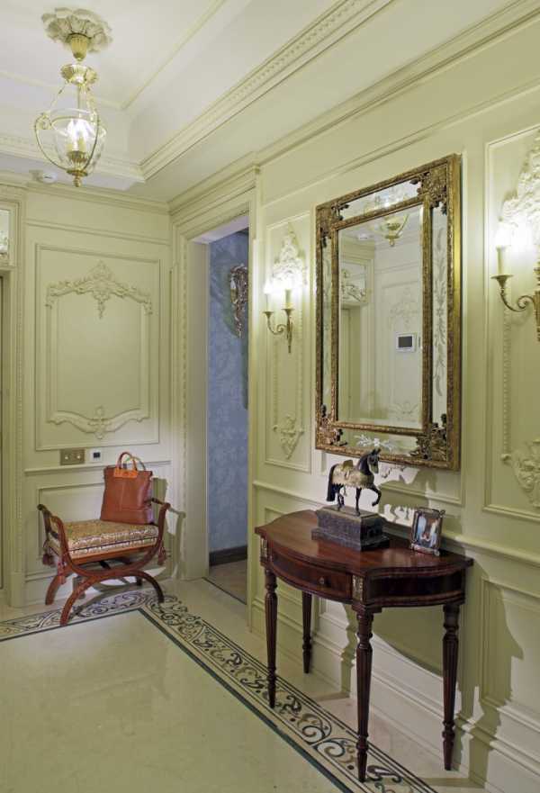 Оформление потолка «под классику»- Материалы, которые можно использовать в качестве отделки стен в маленькой прихожей могут быть самыми разными. Одними из наиболее потребляемых вариантов являются: