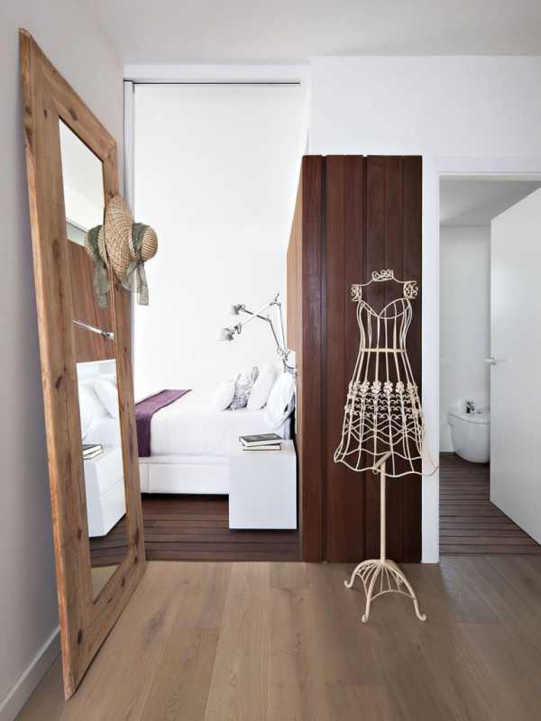 Для экономии места зеркало целесообразно закрепить и на дверях шкафа, что позволит рассмотреть себя во весь рост непосредственно перед выходом из дома. Многие предпочитают устанавливать зеркало от пояса до головы на свободной стене. При таком варианте очень удобно под ним расположить тумбу или комод, в котором поместятся все мелкие вещи.