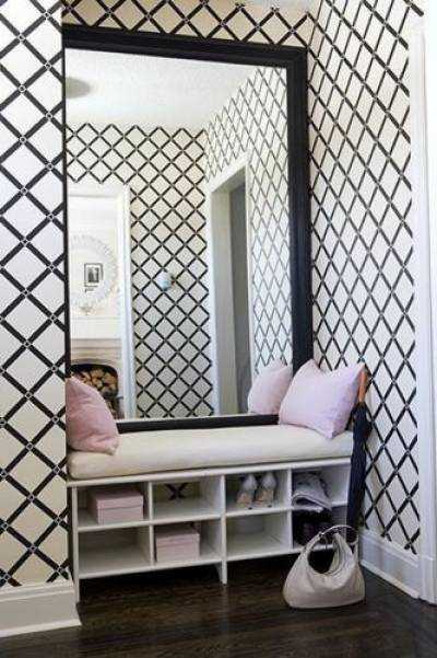 Важным предметом в прихожей, является зеркало. Его можно повесить, как на стену, так и расположить на межкомнатной двери, такой ход, позволит увеличить пространство. Большого количества зеркал в прихожей, стоит избегать, иначе ваши гости потеряются в ней, приняв за туннель.