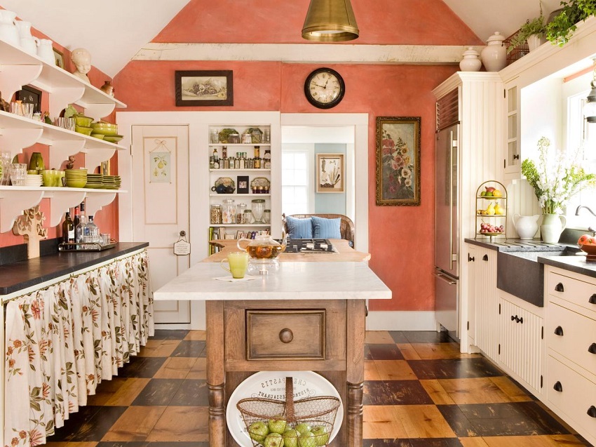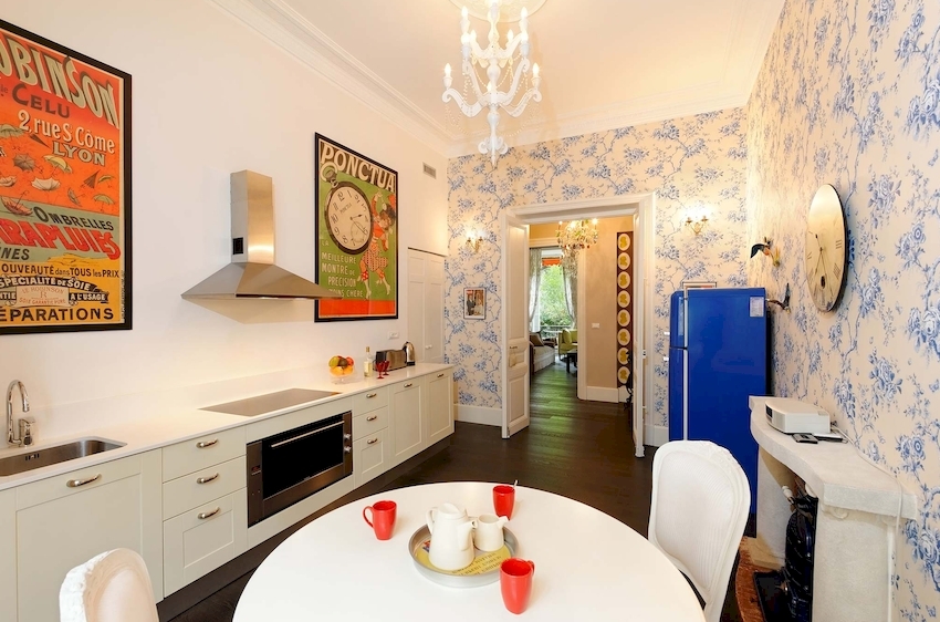 Как правило, здесь применимы обои с рисунками, светлых тонов, может быть выбрана и вертикальная полоса, цветочек, клеточка, а может и другие вариации, на которых изображены кафе Европы или провинциальные мотивы. Зачастую используются оттенки более приглушенные, например, оливковые, пшеничные, песочные или бежевые.