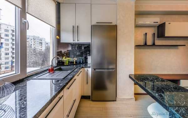 Для большей экономии полезного пространства рекомендуется под окном установить узкую рабочую поверхность. Такой вариант дизайна маленькой кухни удобен еще и тем, что в этом месте днём хорошее естественное освещение. Шторы на кухне в этом случае нужно делать короткими, если квартира находится на высоком этаже, то их можно сделать на половину окна. Другим вариантом будет использование высокого подоконника в качестве барной стойки.