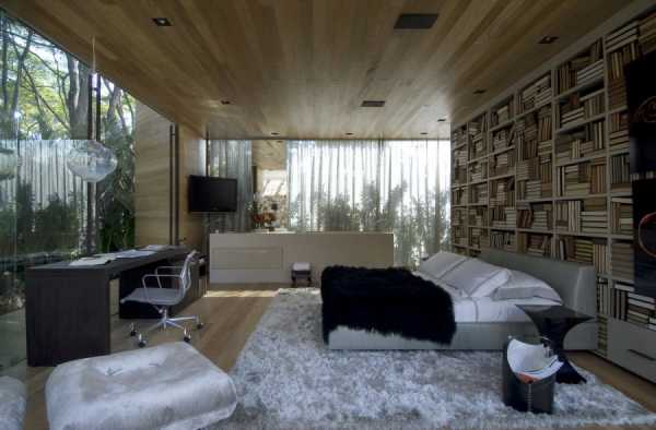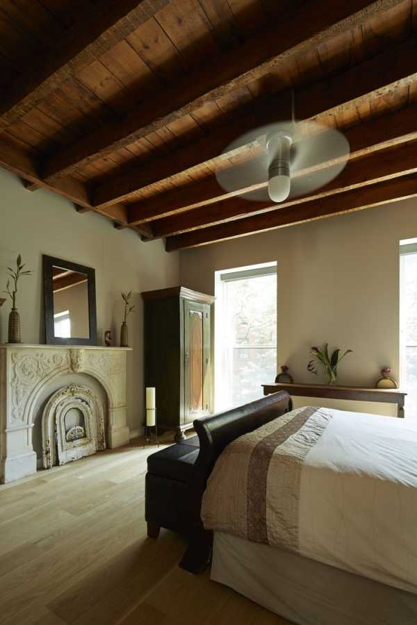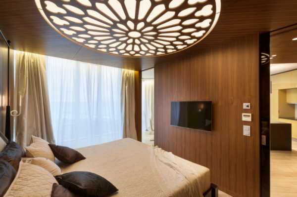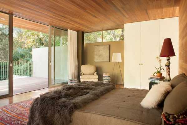 Деревянное оформление потолочной плоскости сделает спальню гораздо уютнее и добавит в нее атмосферу камерности и некого шарма.